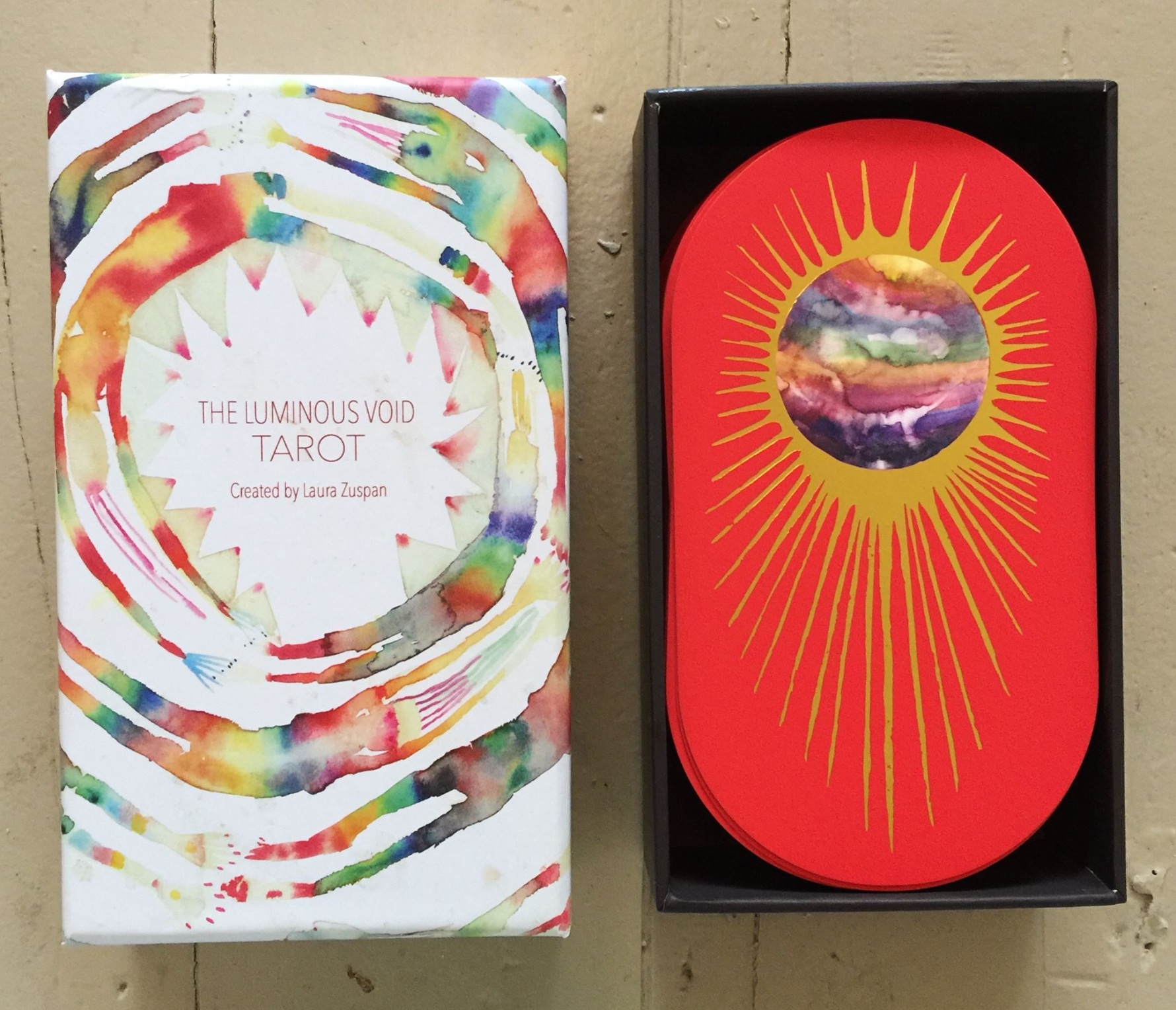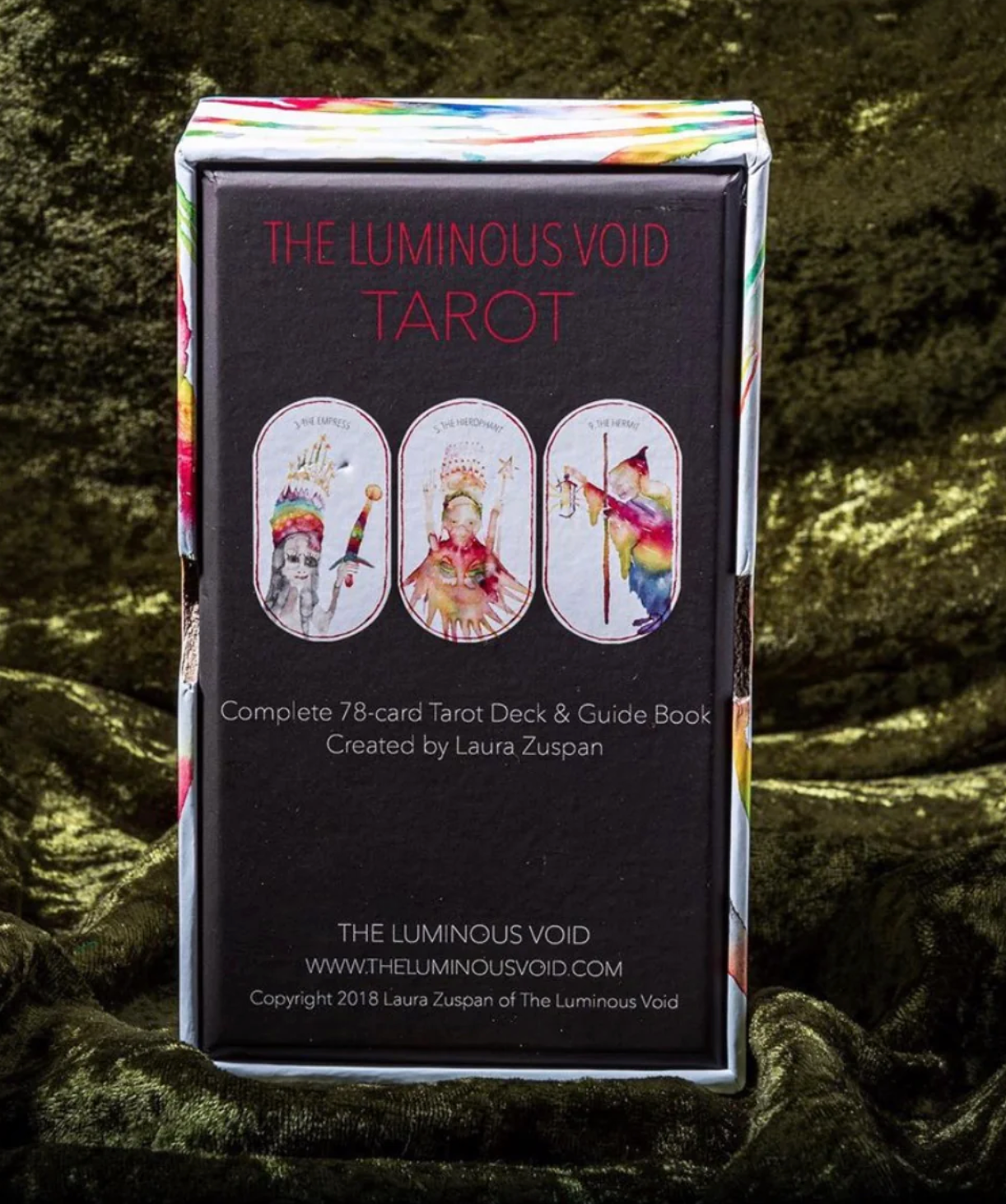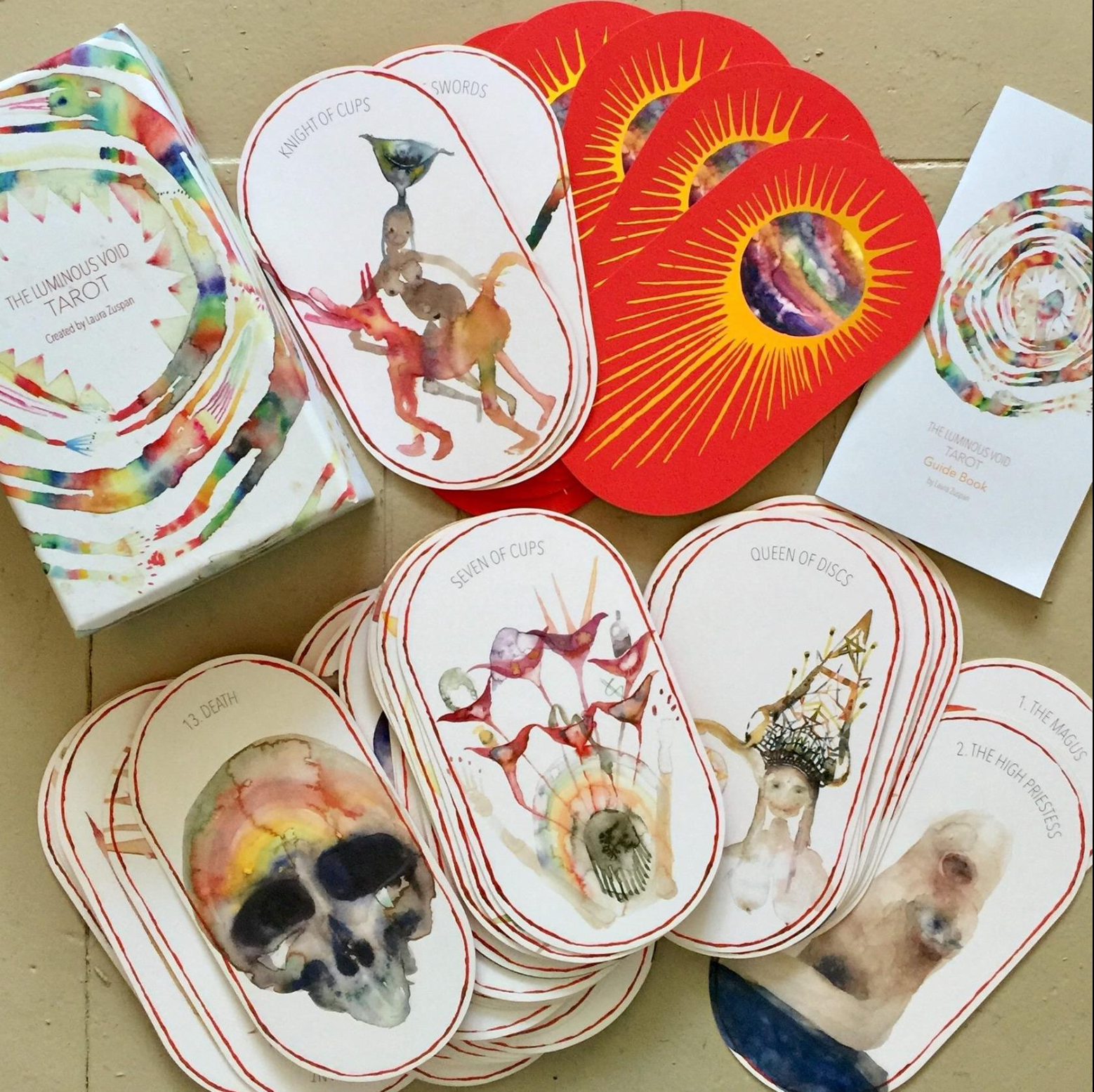 Luminous Void Tarot was created as a ceremonial art object, a sculptural jewel ideal for ancestor reverence and communication, meditation and divination. It captures the subconscious shamanic realms of consciousness. It loosely follows the structure and symbolism of the Rider-Waite Smith Deck. It was created by Laura Zuspan an artist, healer, meditator and teacher. All art is original watercolor.