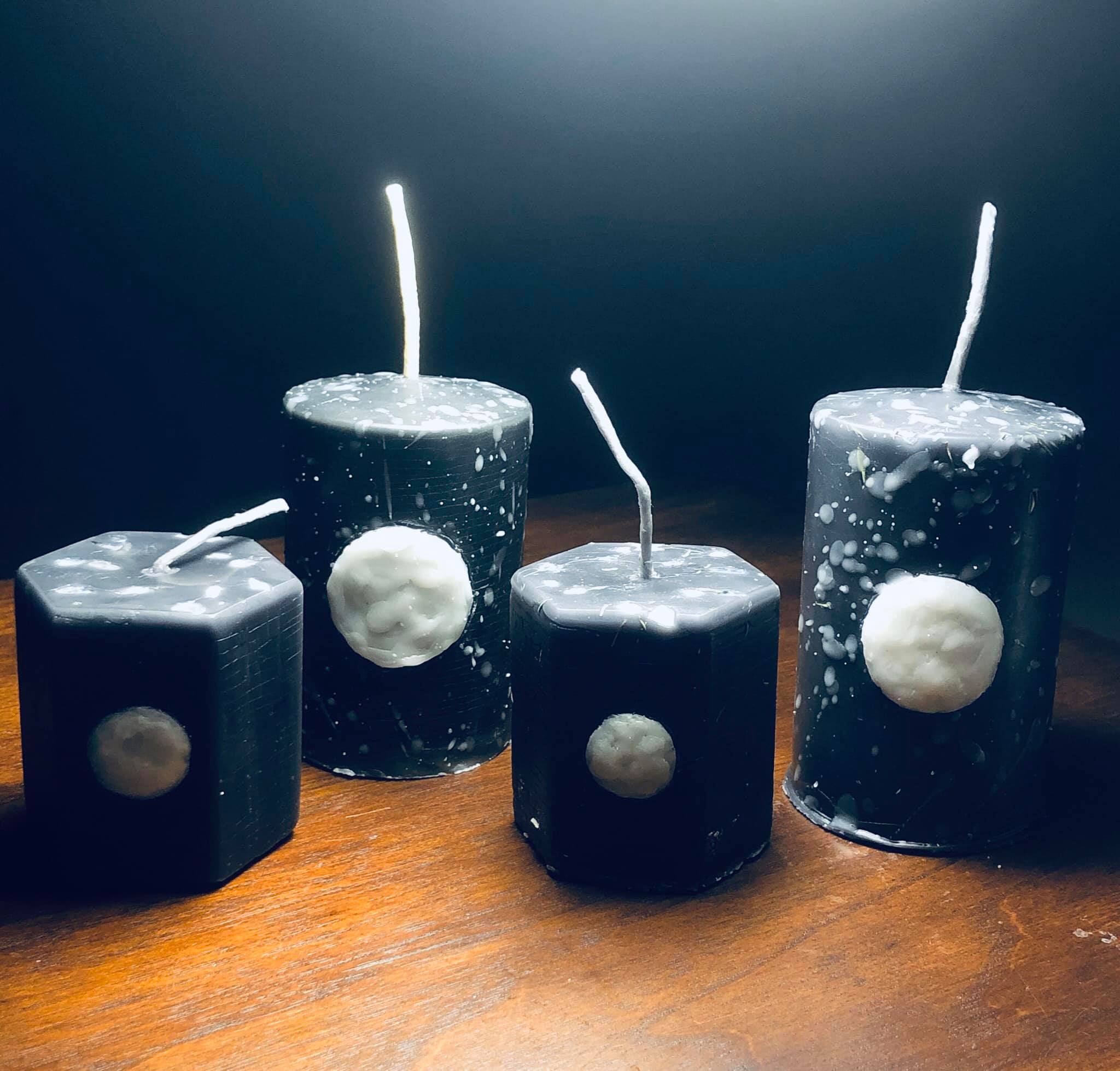Full Moon/Night Sky black beeswax candles infused with moonstone & herbs.